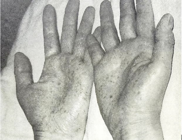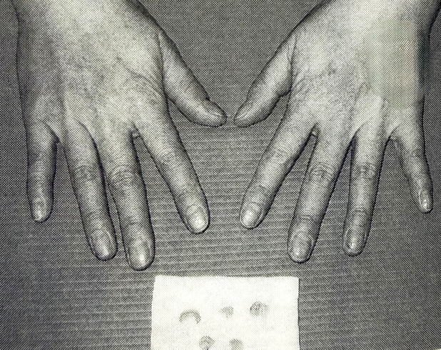 (写真左)掌蹠膿疱症で手のひらや爪の中まで黄色く膿んだ手